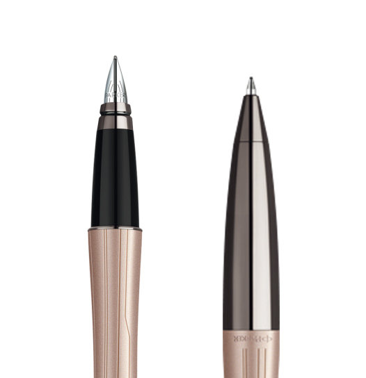 Wykończenia chromowe. Metaliczno - różowy lakier. Zdobiony wyjątkowym, liniowym wzorem na powierzchni. Stalówka typu F wykonana ze stali nierdzewnej.