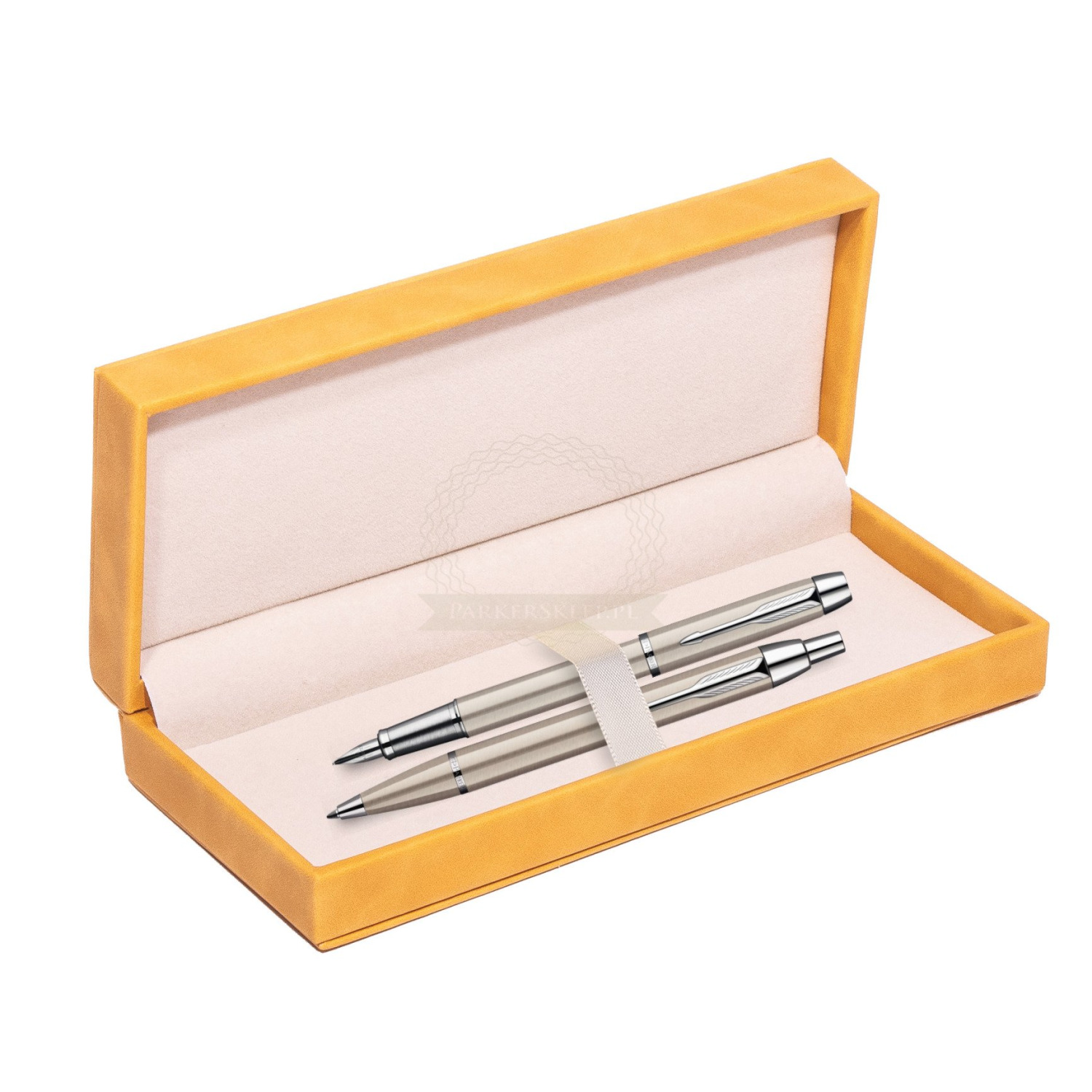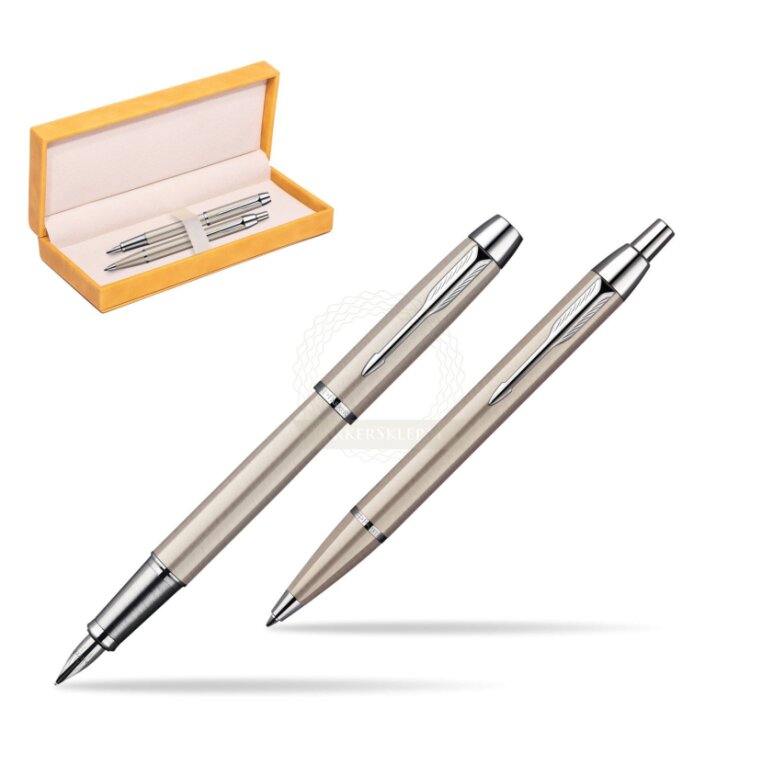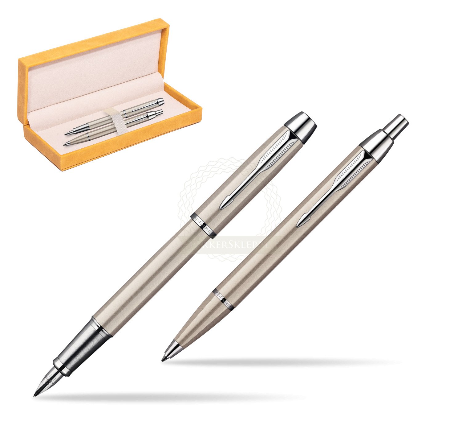 Zestaw prezentowy Parker pióro + długopis IM Brushed Metal CT w żółtym pudełku zamszowym Parker IM