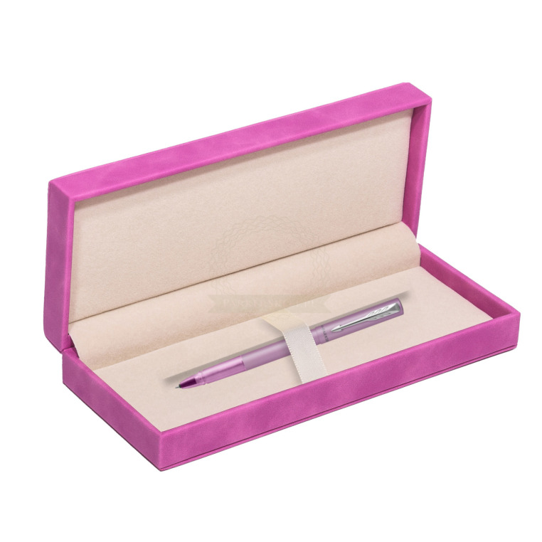 Metaliczne wykończenie w satynowym liliowym kolorze uzupełnione chromowanymi wykończeniami i charakterystycznym klipsem w kształcie strzałki PARKER.