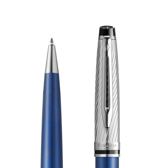 Długopis Expert Deluxe Blue pozwala wyrazić górnolotne ambicje oraz wyjątkowy gust. Końcówka długopisu kreśli nieskazitelne linie szybkoschnącego tuszu. Zwężający się kształt korpusu i wygrawerowany na nasadce profilowany wzór pasków, których inspiracją jest ponadczasowa elegancka moda męska, dodają użytkownikowi francuskiego szyku, pewności siebie i autorytetu podczas każdej okazji wymagającej pisania. Lakierowany korpus w metalicznym odcieniu niebieskiego, charakterystyczny rozdwojony klips Waterman i nasadka z fasetami tworzą spójną całość zapewniającą doskonałe wrażenia podczas pisania. Kolekcja Expert Deluxe – Symbol ambicji