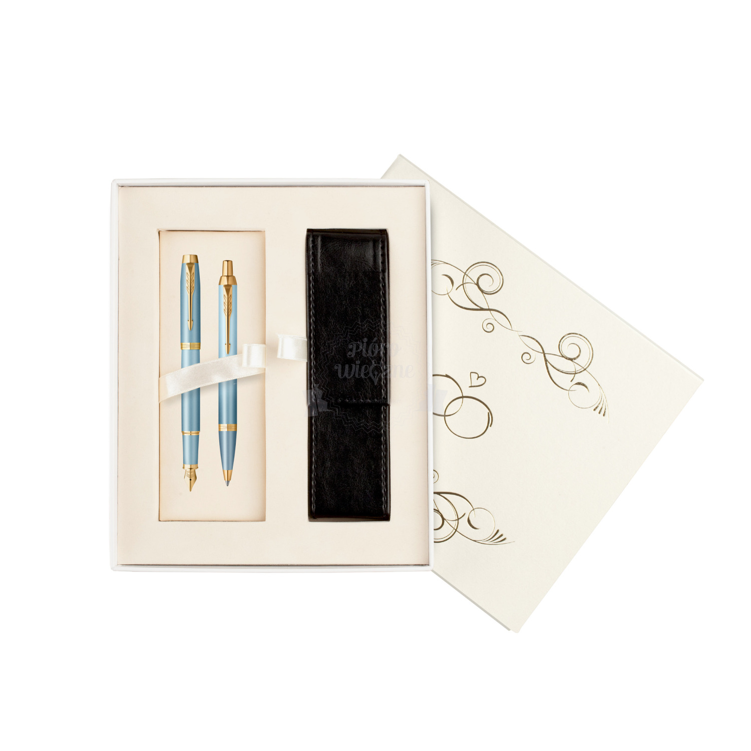 Proponujemy Państwu eleganckie pudełko prezentowe "hand made" w kolorze ecru, przeznaczone na dwa produkty Parker. Tłoczone wzorkiem na powierzchni Pudełko zawiera stylowe etui wykonane z czarnej ekoskóry. Wyściełane atłasem, posiada eleganckie, prezentowe tasiemki. Zamykane na magnes.
