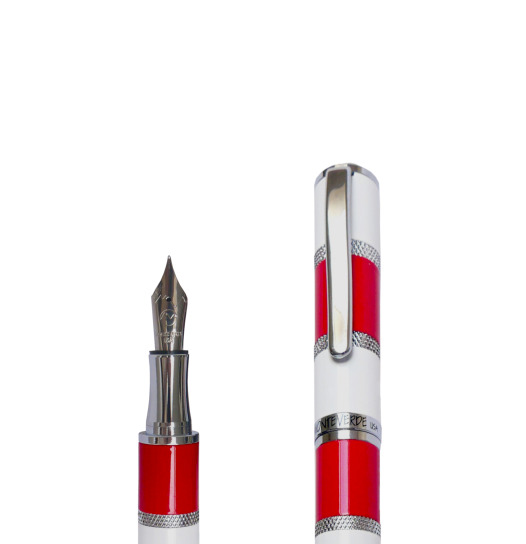 Pióro wyróżnia się srebrnymi wykończeniami oraz stalówką ze stali nierdzewnej.
