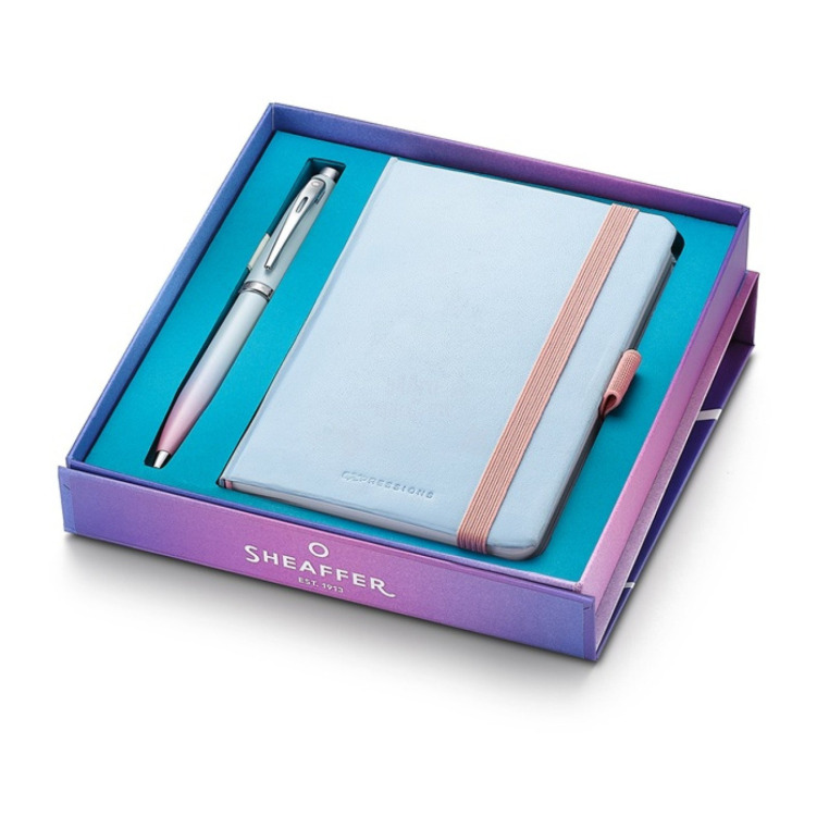 Zestaw Sheaffer 100 Expressions, w którym ponadczasowy design spotyka się z rytmem współczesności, został stworzony dla tych, którzy przewodzą i wyrażają się jasno. Długopis z kolekcji S100, model 9376, wykończony w efektownym, perłowych odcieniach niebieskiego i różowego, wykończenia chromowane. Sheaffer oferuje sprawdzoną jakość pisania z żywym, nowoczesnym charakterem. Długopis w połączeniu z wyjątkowym notesem w rozmiarze A6 z gładkimi, przyjaznymi dla atramentu stronami.