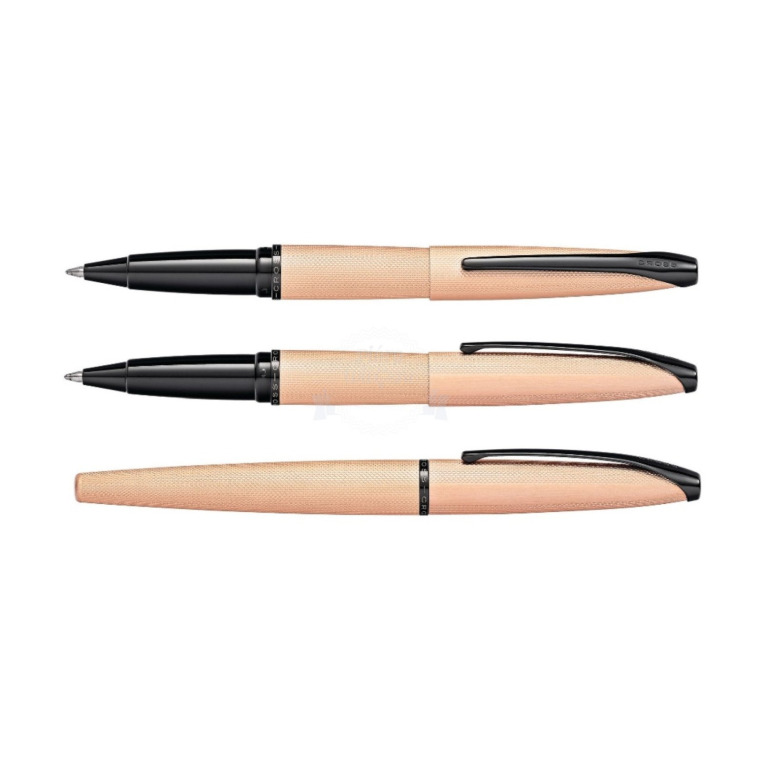 Pióro kulkowe Cross ATX posiada korpus i skuwkę z fakturą w diamenty w kolorze różowego złota i czarne elementy powlekane metodą PVD. Produkt zapakowano w etui premium.