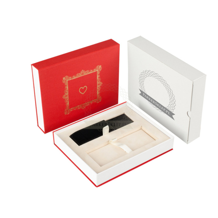 Proponujemy Państwu eleganckie pudełko prezentowe "hand made" w kolorze czerwonym, przeznaczone na dwa produkty Parker. Powierzchnia pudełka powleczono specjalnym płótnem. Tłoczone wzorkiem na powierzchni. Pudełko zawiera stylowe etui wykonane z czarnej ekoskóry. Wyściełane atłasem, posiada eleganckie, prezentowe tasiemki. Zamykane na magnes.