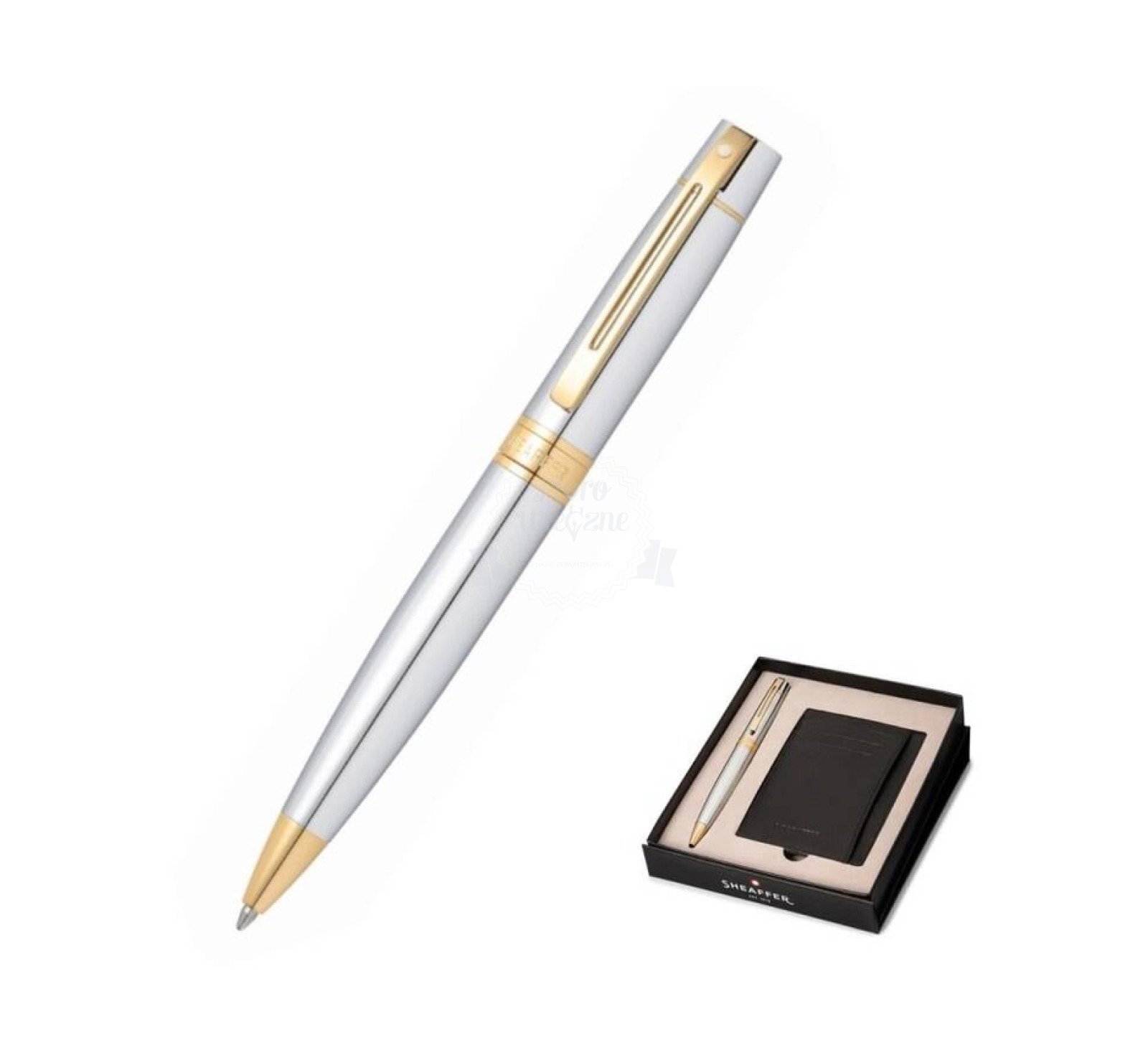 Zestaw prezentowy Sheaffer składa się z czarnego długopisu 9312 BP z kolekcji 300 i skórzanego czarnego etui na karty kredytowe. Długopis posiada chromowane wykończenia. Długopis wraz ze skórzanym czarnym etui na karty kredytowe został zapakowany w eleganckie czarne pudełko prezentowe.