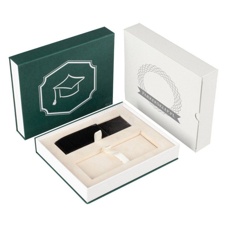Proponujemy Państwu eleganckie pudełko prezentowe "hand made" w kolorze ciemnej zieleni, przeznaczone na dwa produkty Parker. Powierzchnia pudełka powleczono specjalnym płótnem. Tłoczone wzorkiem na powierzchni. Pudełko zawiera stylowe etui wykonane z czarnej ekoskóry. Wyściełane atłasem, posiada eleganckie, prezentowe tasiemki. Zamykane na magnes.