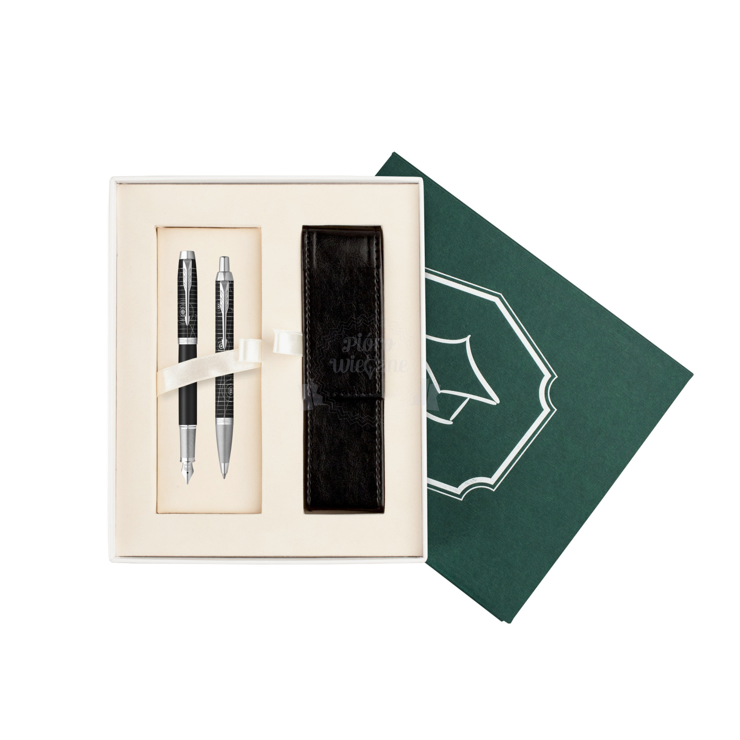 Proponujemy Państwu eleganckie pudełko prezentowe "hand made" w kolorze ciemnej zieleni, przeznaczone na dwa produkty Parker. Powierzchnia pudełka powleczono specjalnym płótnem. Tłoczone wzorkiem na powierzchni. Pudełko zawiera stylowe etui wykonane z czarnej ekoskóry. Wyściełane atłasem, posiada eleganckie, prezentowe tasiemki. Zamykane na magnes.