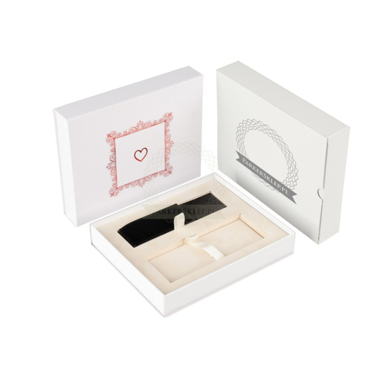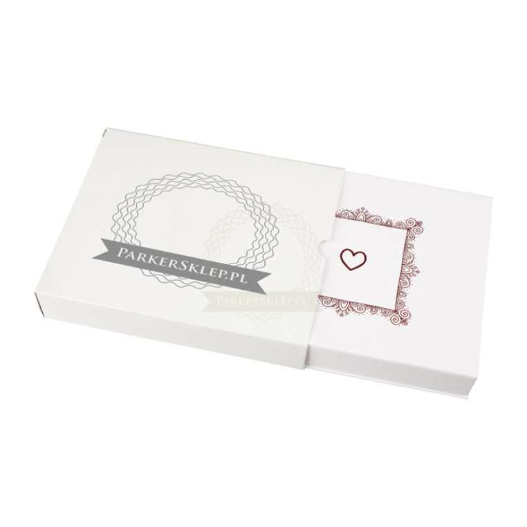 Proponujemy Państwu eleganckie pudełko prezentowe "hand made" w kolorze bieli, przeznaczone na dwa produkty Parker. Powierzchnia pudełka powleczono specjalnym płótnem. Tłoczone wzorkiem na powierzchni. Pudełko zawiera stylowe etui wykonane z czarnej ekoskóry. Wyściełane atłasem, posiada eleganckie, prezentowe tasiemki. Zamykane na magnes.