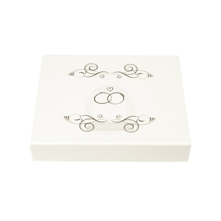 Tabliczka z dedykacją mocowana jest w środku wieczka pudełka jeżeli w pudełku występuje wieczko lub przyklejana na ściankę pudełka jeżeli w pudełku nie ma wieczka.